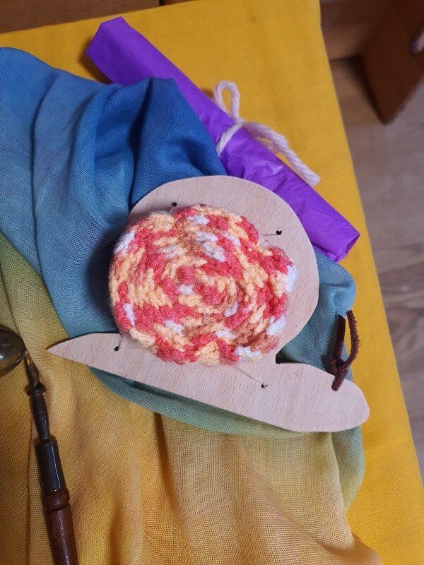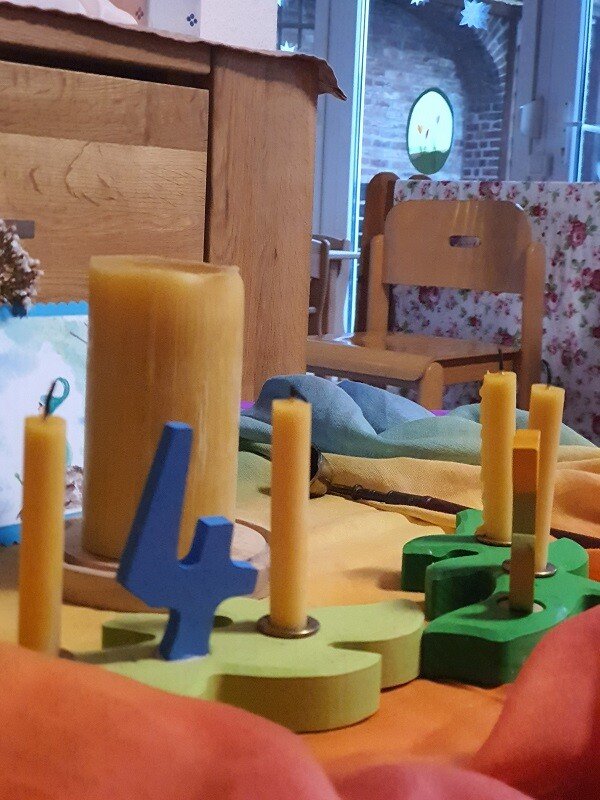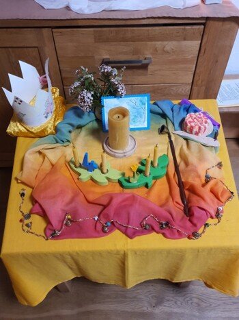 Der Geburtstag wird von vielen Liedern begleitet. Wie auch sonst im Kindergartenalltag begleiten wir Tätigkeiten gern mit Gesang. Lieder schaffen Stimmung, geben Orientierung und tragen die Kinder durch den Ablauf. Der Geburtstagstisch wird mit großer Sorgfalt vorbereitet. Es ist uns wichtig, dass alles stimmig wirkt und ein schönes Gesamtbild entsteht, für uns und für die Kinder. Zuerst legen wir ein gelbes Tuch auf den Tisch. Es steht für das Licht und für die Sonne. Darüber legen wir ein Regenbogentuch, das kreisförmig gerafft wird. Der Regenbogen kann als Bild für das Himmelstor verstanden werden, für den Übergang zwischen Himmel und Erde. Die Tücher sind sorgfältig gebügelt und so gelegt, dass sie schön fallen. Sie bilden die Grundlage für alles Weitere auf dem Tisch. Darauf entsteht dann der Geburtstagstisch: mit dem Kerzenkreis mit so vielen Kerzen, wie das Kind Jahre alt wird, dem Lebenslicht in der Mitte, einem Blumenstrauß für das Geburtstagskind, der selbst gemalten Geburtstagskarte, dem Geburtstagsgeschenk der Gruppe, dem Geburtstagsumhang, der selbst gestalteten Geburtstagskrone, einer Glöckchenkette, Streichhölzern und Kerzenlöscher. Auf dem Öltröpfchentablett liegt heute noch eine kleine goldene Märchenkugel und unter der Muschel mit dem Öl liegt sonnengelbe Märchenwolle.