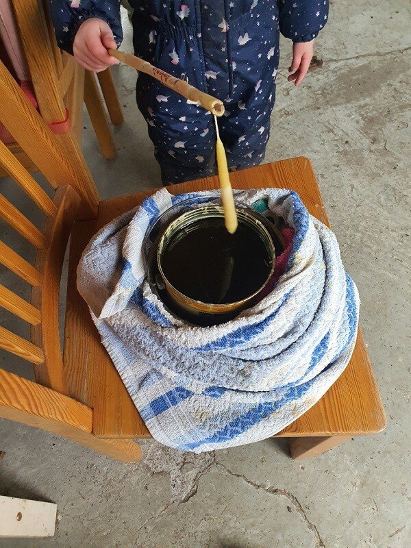 Ein fester Bestandteil der Adventszeit ist auch das Kerzenziehen, das wir draußen durchführen. Die Kerzen aus reinem Bienenwachs schaffen eine ganz besondere Atmosphäre. Ihr warmes, ruhiges Licht vermittelt Geborgenheit, und der unverwechselbare Duft des Bienenwachses weckt in der kalten Jahreszeit Erinnerungen an warme Sonnentage. Diese Kerzen werden ebenfalls Teil der Krippengärtlein.