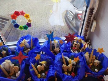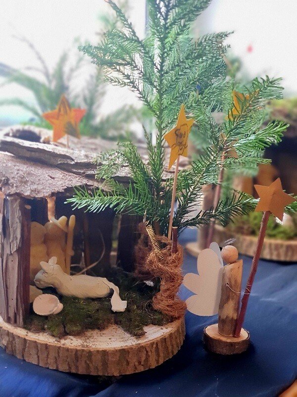 In der Woche nach dem Adventgärtlein beginnen wir mit der Gestaltung der Krippengärtlein. Jedes Kind erhält eine kleine Tonschale, die es zunächst mit Sand füllt. Darauf legen die Kinder Moos und stecken einige Zweige Tannengrün hinein, das von der Adventsspirale stammt. Die Krippengärtlein stehen auf der Fensterbank auf einem blauen Tuch, jedes an seinem festen Platz. Damit die Kinder ihre Schale wiedererkennen, bemalen sie einen kleinen gelben Stern, auf den ihr Name geschrieben wird. Mit Bienenwachs an einem Holzspieß befestigt kommt er in das Krippengärtlein. Alle zwei Tage dürfen die Kinder ihr Krippengärtlein vorsichtig mit Wasser besprühen, damit das Moos nicht austrocknet. In dieser Zeit kneten die Kinder Maria und Josef aus kostbarem Bienenwachs, das mit Wollfett vermischt wird. Dadurch wird das Wachs besonders geschmeidig und lässt sich gut formen. Gerade jetzt, in der kalten Jahreszeit ist die Arbeit mit dem warmen, duftenden Bienenwachs eine wohltuende Sinneserfahrung. Die Figuren finden später ihren Platz im Krippengärtlein. Mit den Vorschulkindern baue ich in der Werkstatt einen Stall auf einer Baumscheibe. Aus Naturmaterialien wie Jute, Leder, Holz, Tannengrün, Wolle, geschnittenen Weidenhölzern und Rinde entsteht so ein ganz individueller Stall.
