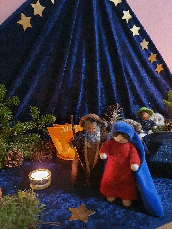 Nach dem ersten Advent singen wir beim Anzünden die erste Strophe von „Wir sagen euch an den lieben Advent“, nach dem zweiten Advent die erste und zweite Strophe und so weiter in den folgenden Wochen. Auf dem Jahreszeitentisch liegt ein Weg aus goldenen Sternen, der die Tage bis zu den Weihnachtsferien symbolisiert. Maria und Josef wandern diesen Weg entlang, begleitet vom Lied: