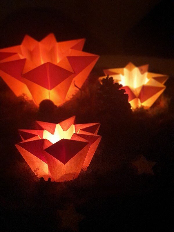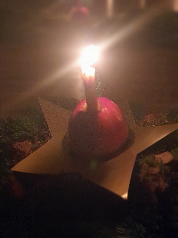 Dann entzünde ich das Christuslicht und setze mich wieder. Anschließend liest meine Kollegin eine Weihnachtsgeschichte vor. Danach gibt sie mir das erste Apfellicht. Während wir „Tief im Gärtlein“ singen, gehe ich in die Spirale, entzünde mein Apfellicht am Christuslicht und stelle es auf einen goldenen Stern aus Pappe. Wenn ich wieder draußen bin und die Strophe verklungen ist, spreche ich den Kindern folgenden Spruch zu: