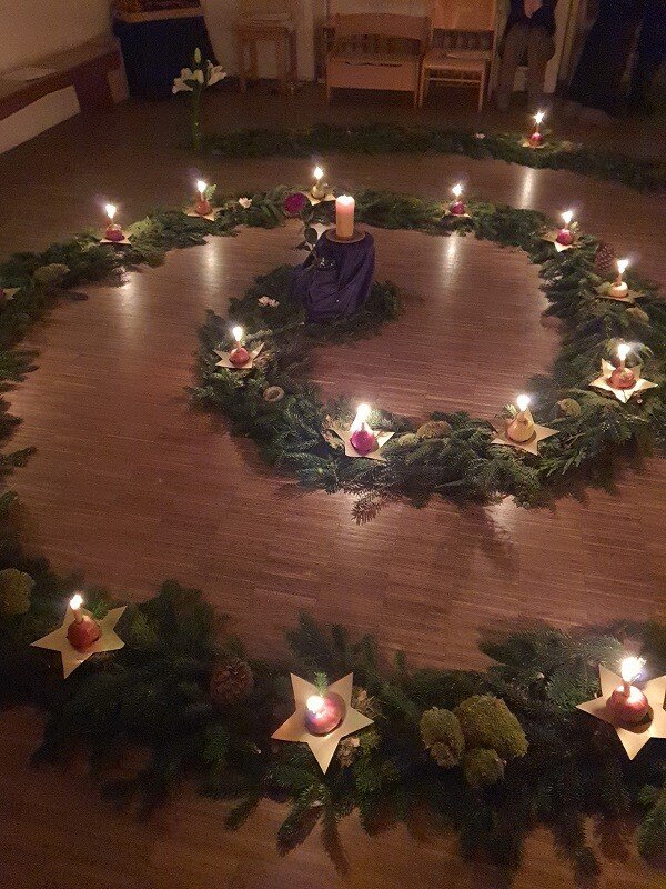 Zu Beginn der Adventszeit, in Vorbereitung auf Weihnachten, feiern wir in unserem Kindergarten das Adventsgärtlein. Es ist ein Fest, das uns und den Kindern Augenblicke der Stille schenkt und uns auf diese besondere Zeit einstimmt. Der Weg in die Spirale ist ein Bild für den Weg in das innere Ich. Ein Weg, der die Individualisierung des Menschen widerspiegelt und dennoch immer wieder zurück in die Gemeinschaft führt.