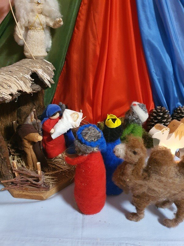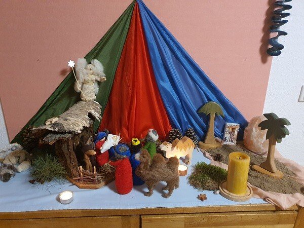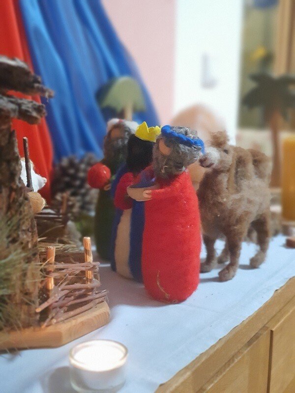 Am letzten Kindergartentag vor den Weihnachtsferien, nachdem alle Kinder abgeholt sind, bereite ich den Jahreszeitentisch auf die kommende Dreikönigszeit vor. Die dunkelblauen Tücher der Weihnachtszeit nehme ich ab und ersetze sie durch ein frisch gebügeltes hellblaues Tuch. Eine Seite des Jahreszeitentisches richte ich als Wüstenlandschaft her: Drei weise Männer machen sich mit ihren Kamelen auf den Weg. Auf der anderen Seite steht der Stall mit Maria, Josef und dem Kind.