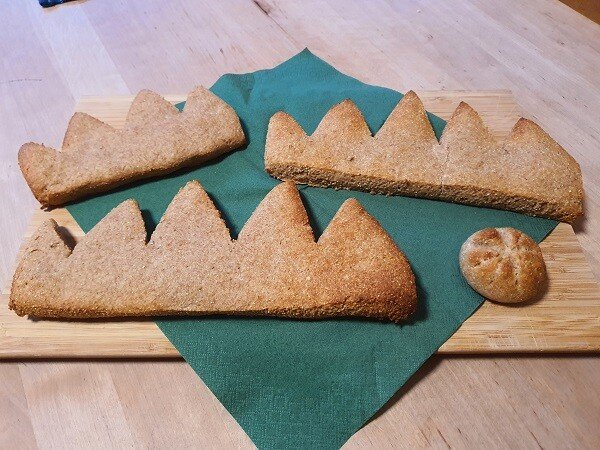 Am Backtag (Donnerstag) in dieser Woche backen wir statt der Brötchen Kronen. Der Teig wird ausgerollt und ich schneide mit dem Messer Kronen aus.
