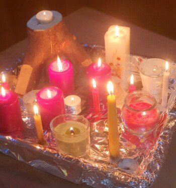 Wir legen ein Ofenblech mit Alufolie aus, die glänzende Seite nach außen. Darauf stellen wir alle Kerzenreste, die sich im Kindergarten im Laufe der Advents- und Weihnachtszeit angesammelt haben. Diese werden angezündet und dürfen im Laufe des Tages ganz ausbrennen. So verabschieden wir symbolisch die Zeit der vielen Kerzen und des Winterlichtes.