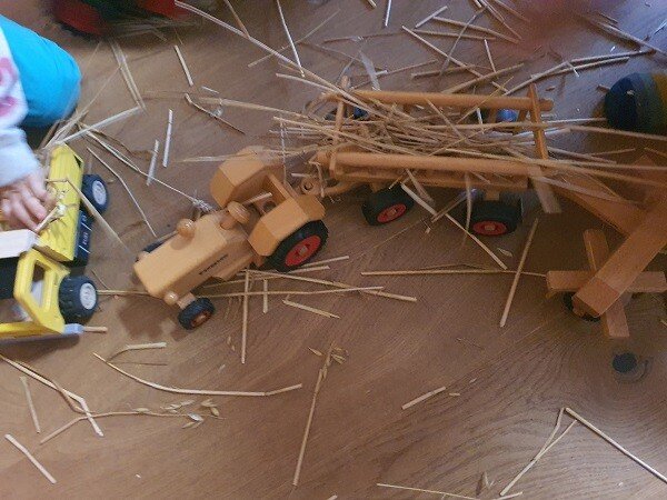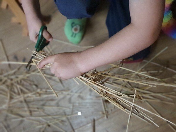 Das Stroh, das beim Schneiden übrigbleibt, dürfen die Kinder mit der Schere in Stücke schneiden. Daraus entsteht in den folgenden Tagen eine rege Spielwelt – LKW“s und Anhänger werden beladen, transportieren das Stroh und das Spiel geht noch lange nach dem Fest weiter.