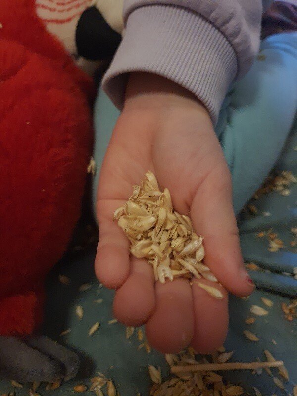 Dann schneiden wir gemeinsam die Ährenköpfe vom Getreide ab, um sie später beim Dreschen zu verwenden. Während der Freispielzeit wird im Nebenraum ein grünes Tuch ausgebreitet – dort entsteht unsere kleine „Dreschstelle“. Die Kinder bekommen Holzklötzchen als Schlegel und beim rhythmischen Dreschen begleitet uns der Vers: