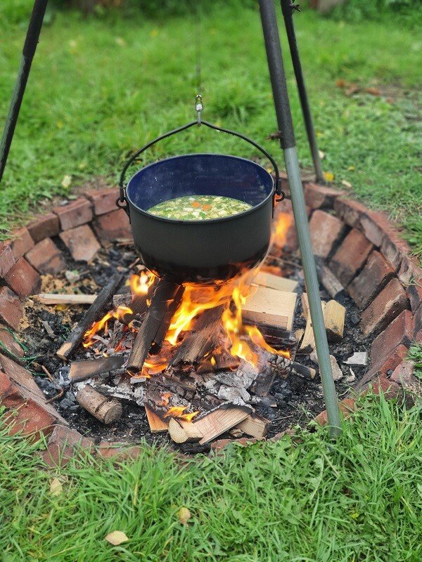 Am Mittag wird draußen über dem Lagerfeuer die Erntedanksuppe gekocht. Das von den Kindern geschnittene Gemüse kommt in den großen Kessel, und während die Suppe duftet und köchelt, ist das Feuer Mittelpunkt unserer Gemeinschaft. Im Freien, am Feuer essen wir unsere Suppe, dazu die restlichen Brötchen vom Frühstück. In der warmen Herbstsonne, am Feuer beieinander sitzend, klingt das Fest in ruhiger und freudiger Stimmung aus.