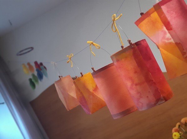 Schon Wochen vor dem Fest beginnt eine Zeit stiller Aktivitäten. Das Aquarellpapier für die Laternen wird zugeschnitten, gern auch von Eltern, die sich während der Eingewöhnungszeit sinnvoll einbringen wollen. Vor den Herbstferien malen die Kinder ihre Laternenbilder mit Aquarellfarben. Nach dem Trocknen werden die Bilder von Kinderhänden geölt. Die Kinder spüren das Öl, die Struktur des Papiers und die Wärme – das ist eine echte Sinneserfahrung. Anschließend dürfen die Bilder zwei Wochen lang ruhen, bis sie vollständig trocken sind. Schritt für Schritt werden dann die Laternen: gefaltet, geklebt, mit Kerzen bestückt und schließlich in der Gruppe aufgehangen. Fensterbilder werden neu gestaltet. Ein Aushang informiert alle Familien über Zeit und Ort unseres Laternenfestes, und in eine Liste können sich Eltern für zusätzliche Weckmänner eintragen.