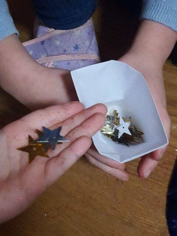 Sie wandern auf einem Weg aus goldenen Sternen. Es liegen so viele Sterne aus, wie es noch Tage zu den Weihnachtsferien sind. Es wird immer ein Stern weiter gezogen. Der zurückgelegte Stern wird weggenommen und an den Sternenhimmel geklebt mit den Worten: