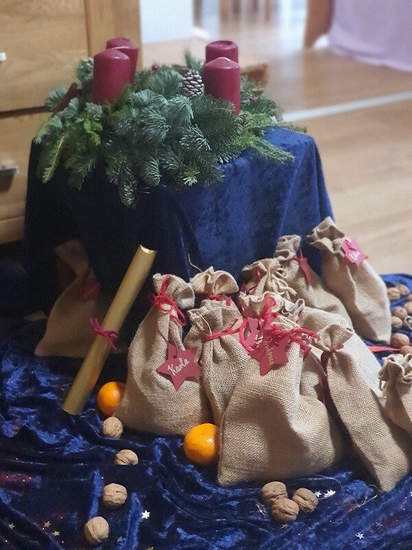 Ich nehme den Brief vom Nikolaus vom Sack und lese ihn vor. Die Kinder hören still zu und staunen darüber, was der Nikolaus so alles weiß. Dann öffne ich den Sack, schaue hinein, staune. Jedes Kind darf einzeln zu mir kommen und etwas aus dem Sack nehmen. Die Kinder behalten ihr persönliches Säckchen zunächst auf dem Schoß. Sie dürfen mal reinlünkern, aber so richtig geöffnet und genascht wird erst zu Hause. In den Säckchen befinden sich die Gaben des Herbstes: Äpfel und Nüsse, auch eine Mandarine und etwas Gebäck, jedoch noch nicht das echte Weihnachtsgebäck. Auch holen wir kleine blaue Säckchen aus dem Nikolaussack. Wir schütteln vorsichtig, hören genau hin und überlegen gemeinsam, was wohl darin sein könnte. Sie werden noch nicht geöffnet, sondern auf den Jahreszeitentisch gelegt (ein Säckchen mit Edelsteinen, ein Säckchen mit Muscheln, ein Säckchen mit Strohblumen). Ein weiteres Säckchen enthält eine wunderbar duftende Bienenwachskerze. Auch die Nusskette befindet sich im Sack. Wir hängen sie direkt an einen kleinen Haken neben dem Jahreszeitentisch. Ab dem nächsten Tag darf dann jeden Tag ein Kind eine Nuss abschneiden, als täglicher Weg bis Weihnachten. Ist der Sack leer, stellen die Kinder ihre Säckchen an den Hocker beim Adventskranz. Der Stuhlkreis wird mit dem Lied: „Rinke, ranke, Rosenschein“ aufgelöst. Zum Frühstück gibt es Milchreis, sowie die Honigkuchen aus dem Nikolaussack. Der Milchreis wird in kleiner Menge gekocht, sodass Kinder, die keinen Honigkuchen mögen, beim Vertrauten bleiben können. Bei Abholung erhält jedes Kind sein Säckchen mit nach Hause.