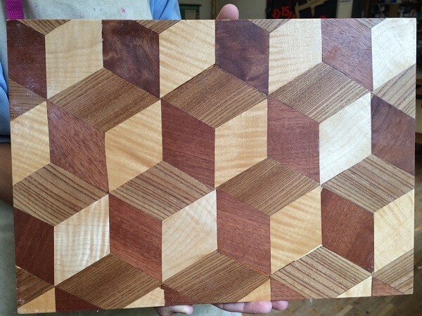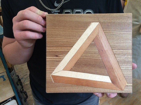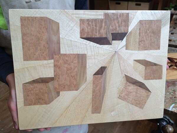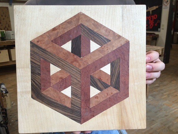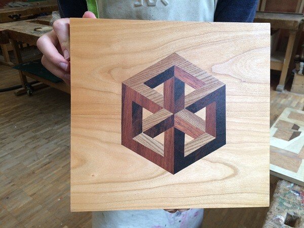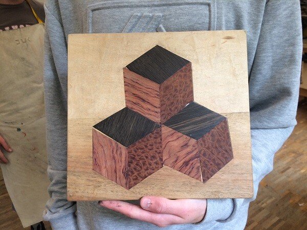 In diesem Kurs haben wir uns mit den Grundlagen dieser Technik vertraut gemacht und sie praktisch angewendet. Durch das Fügen verschiedener Furniere entstanden optische Täuschungen und Trugbilder. Nachdem wir einige kunsthandwerkliche Beispiele betrachtet hatten, fertigten die Schüler:innen eigene Entwürfe mit Papier und Bleistift im Originalmaßstab an. Anschließend wurden die Flächen aus unterschiedlichen Furnieren herausgeschnitten und wie bei einem Puzzle wieder zusammengesetzt und auf eine Trägerplatte geklebt. Nur mit Sorgfalt und Gewissenhaftigkeit konnten überzeugende Ergebnisse erzielt werden. Im Verlauf der zwölf Unterrichtseinheiten à 90 Minuten, entstanden einige schöne Werke.