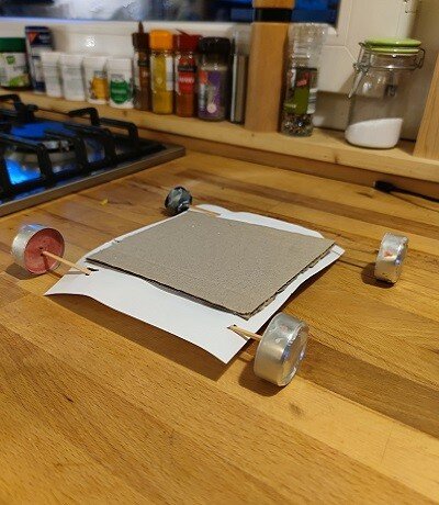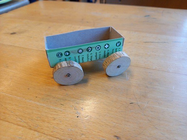 Baut einen kleinen Wagen, auf dem man Lasten transportieren könnte. Er soll zwei Achsen und vier Räder haben. Welche Materialien ihr wählt, überlasse ich ganz euch. Aber bitte kein Lego:-).