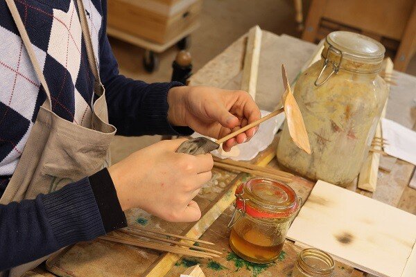 Zuerst wurde die komplexe, geschwungene Form besprochen, manche Kinder skizzierten sich die Form mit Bleistift vor. Im nächsten Schritt bearbeiteten die Kinder das Holz mit dem Handschnitzmesser, der Raspel und der Feile. Dieser Arbeitsschritt erfordert Geduld und Fingerspitzengefühl. Mit Schleifpapier verschiedener Körnungen wird die Oberfläche abschließend verfeinert, bis sie glatt und angenehm anzufassen ist.