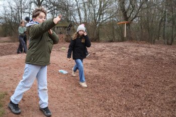 Der große Moment war gekommen: Die selbstgebauten Propeller sollten nun ihre Flugtauglichkeit unter Beweis stellen. Wir gingen zum Hügel bei den Tischtennisplatten und dem Kletterturm. Ein leichter Wind wehte über den Platz. Der Hügel bot eine natürliche Startrampe, und einige mutige Schüler nutzten sogar den Kletterturm. Würden sie fliegen? Die Propeller wurden durch das Abdrehen der Achse in der Hand angetrieben.