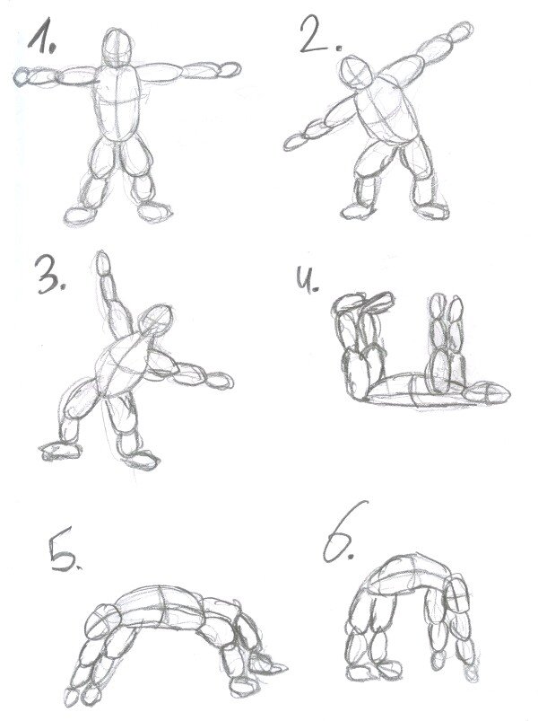 Die Aufgabe der Schüler bestand nun darin, bildnerisch eine eigene Rückengymnastik von 8 Übungen zu erfinden. Ich regte die Schüler an, die verschiedenen Haltungen im Stile der Holzgliederpuppen zu zeichnen.