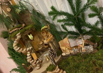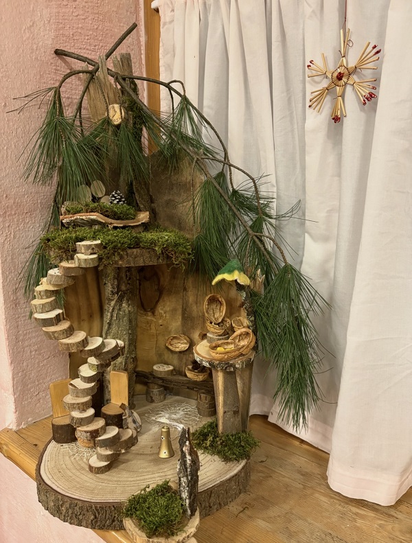 Seit einigen Tagen herrscht in unserer dritten Klasse eine besondere Stimmung: Ganz leise, fast unbemerkt, ist ein kleiner Wichtel eingezogen. Sein neues Zuhause entstand aus allerlei Naturmaterialien, die die Kinder mit großer Freude aus Wald und Garten mitbrachten. Aus Moos, Ästen, Rindenstücken, Steinen und kleinen Schätzen der Natur gestalteten einige eifrige Baumeister der Klasse ein warmes, einladendes Heim für den kleinen Wichtel. So fügt sich das Häuschen harmonisch in die kommende Hausbauepoche ein und trägt die Handschrift der Kinder, die mit viel Liebe zum Detail gearbeitet haben.