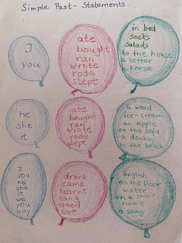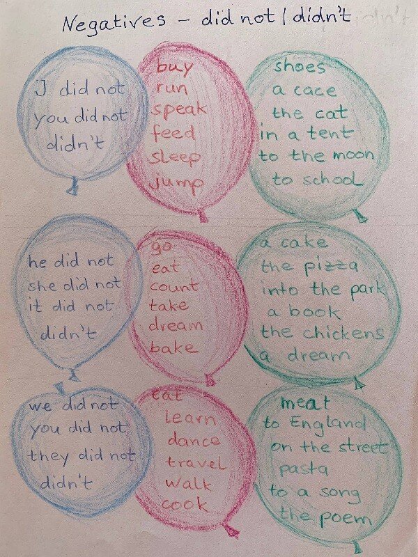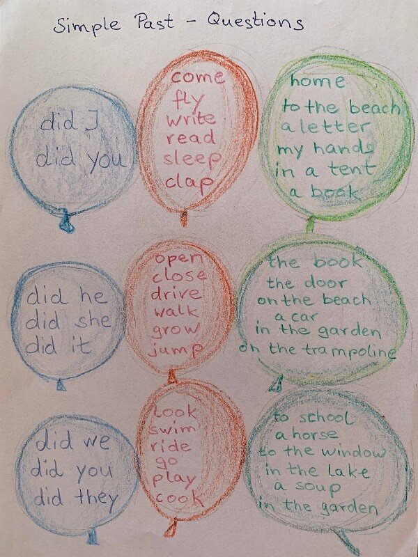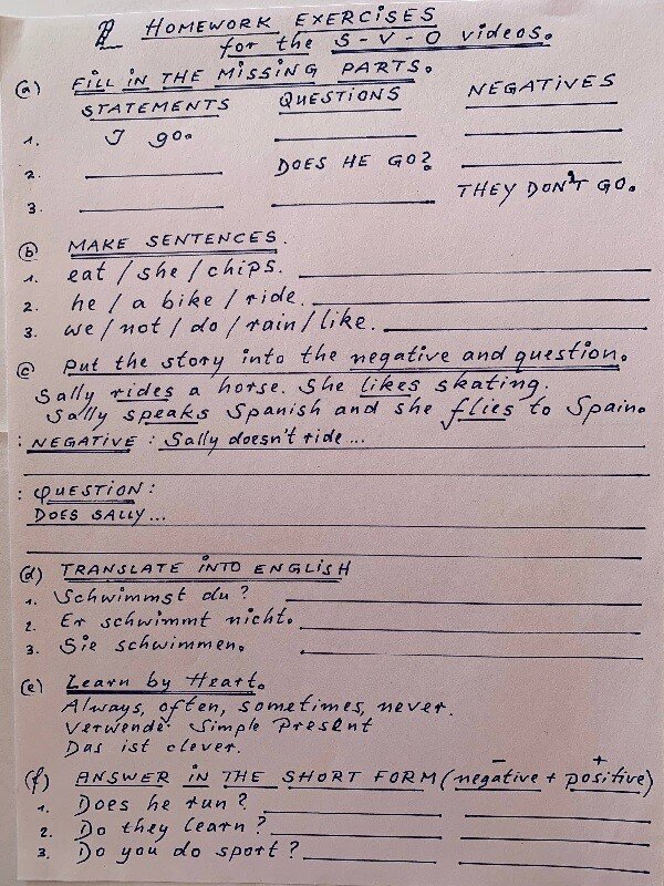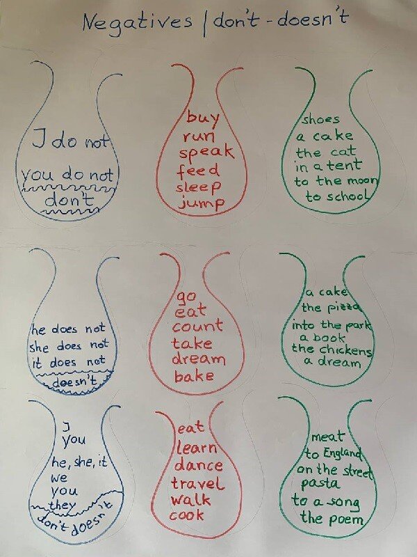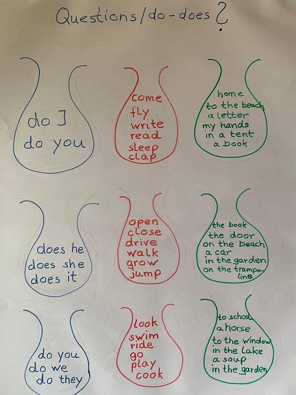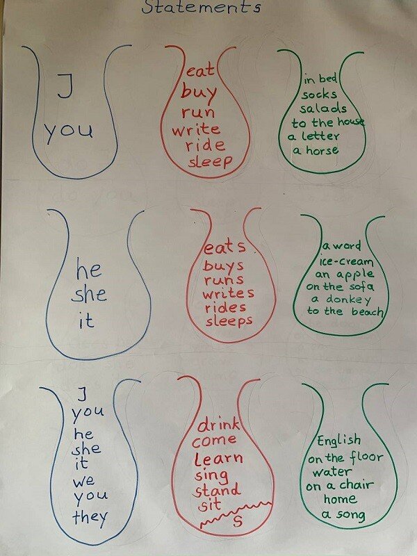 Videos explaining the English sentence construction, SVO, statements, questions and negatives. Jingles and rhythmical rules see previous videos.