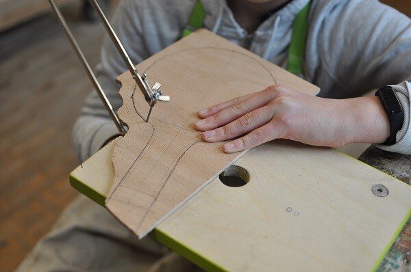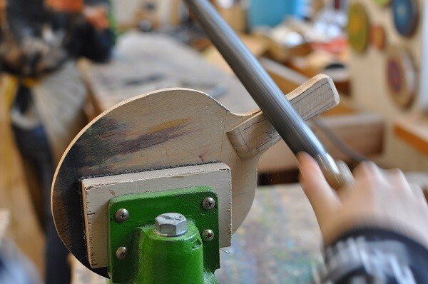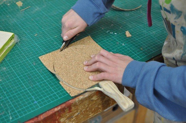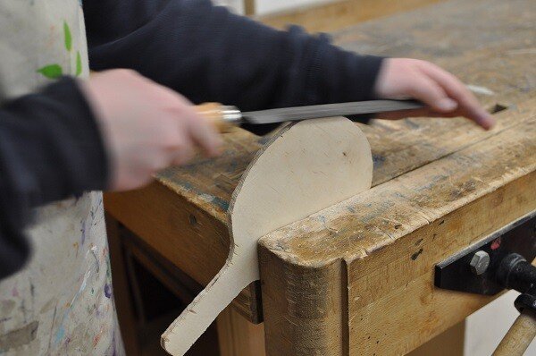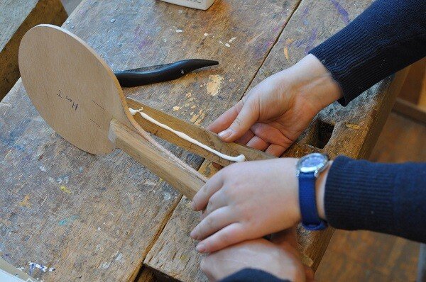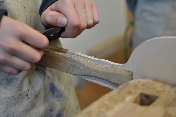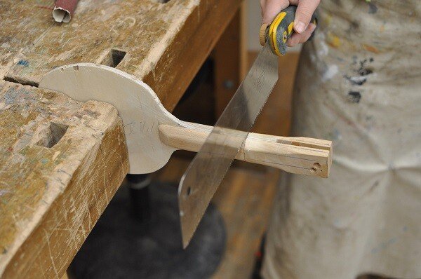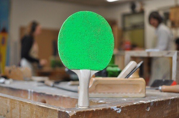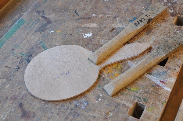 Die Tischtennisplatten auf unserem Schulhof sind nicht nur in den Pausen sehr gut besucht. Daher bot es sich an, die Begeisterung der Kinder im Werkunterricht aufzugreifen und Tischtenniskellen bauen zu lassen. Die Arbeit mit der Laubsäge kann von Sechstklässler:innen sehr gut bewältigt werden. Der Umgang mit Säge, Raspel, Feile und Ziehhobel ist durch vorangegangene Arbeiten bereits vertraut. Für die Schlagfläche eignet sich 3 mm dicker Kork sehr gut. Wer will, kann seine Kelle mit dem Brandmalkolben markieren. Auch die Gestaltung der Schlagfläche ist mit Acrylfarbe gut möglich. Ob gerade, konkav, anatomisch oder konisch, versierte Spieler:innen kennen die Vorteile verschiedener Griffformen und bauen ihren Favoriten (siehe letzte Bild).