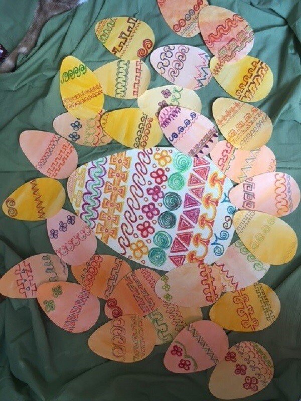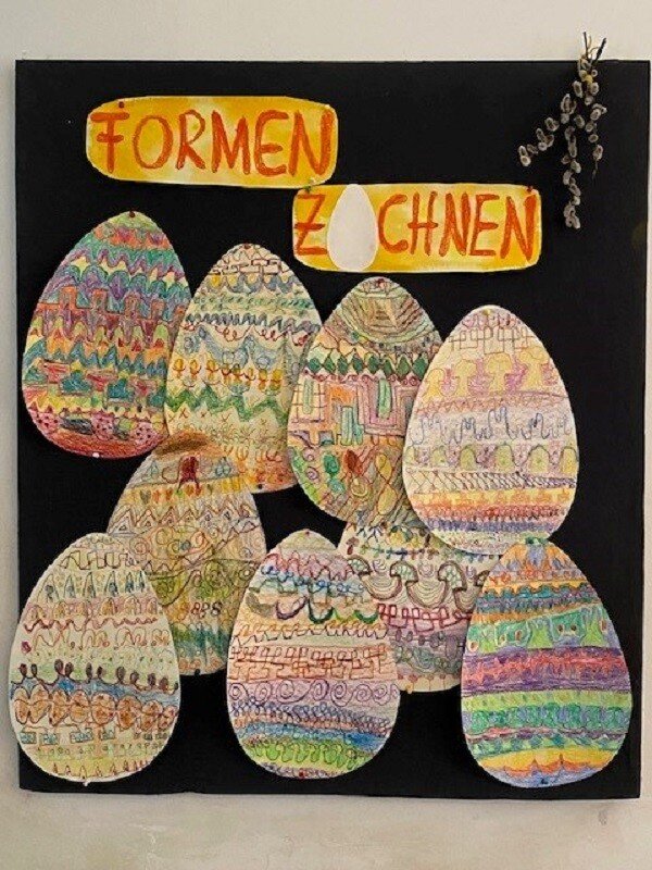In der 1. Klasse fiel unser „Epochenabschluss“ in die Osterzeit. Da haben wir unsere erübten Formen auf Ostereier in Papierform übertragen. Auch entwickelten die Kinder auch eigene Formen weiter.