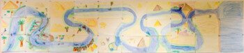 Nach einem gemeinsamen Gespräch über den Nil zeichnete ich mit Bleistift eine geschwungene Mittellinie über alle aneinandergereihten Blätter – so entstand ein durchgehender Flusslauf, der auf jedem Blatt ein bis zwei Mal erschien. Nun begann die eigentliche Arbeit.
