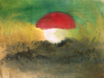 Aquarellbild Nass in Nass zur Pflanzenkunde der 5. Schulstufe Blatt Querformat. Mit Wasser einstreichen. Bei den Schwammerl grundierst du wieder gelb. Stell dir die Diagonale von links unten nach rechts oben vor. Auf dieser Diagonalen sitzen dann deine Schwammerl. Dementsprechend ist nur das linke obere Eck in Zitronengelb, der Rest ist Goldgelb grundiert. Dann tupfst du vorsichtig mit der Ecke vom Mal-Schwamm (Küchenschwamm geht auch) eine Seite vom Eierschwammerlstängel weiß und tupfst auch den unteren Hutrand heraus. Schau, dass du kleine und große Schwammerl schaffst. Dann lässt du das Preußischblau von links oben bis zu den Hüten „herunterschweben“von rechts unten kommt Ultramarin „gekrochen“ und umhüllt die Stängel. Dann noch ganz wenig Zinnoberrot von unten „heranpirschen“ lassen. Fertig.