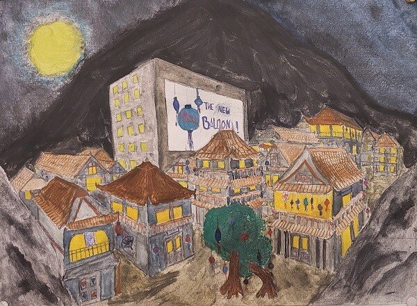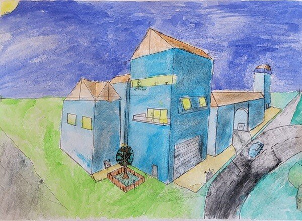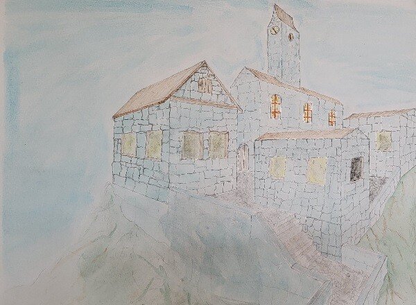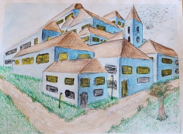 Im 8. Schuljahr knüpfte der Zeichenunterricht an die im Vorjahr erlernten Grundlagen des perspektivischen Zeichnens an. Die Schülerinnen und Schüler entwarfen eine Stadt- oder Dorflandschaft, die sie mit Bleistift und Lineal in Zweipunktperspektive umsetzten.