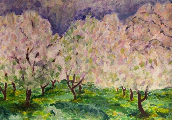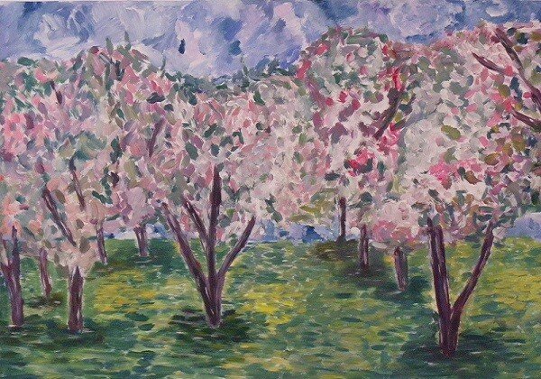 Die impressionistischen Bilder fanden großen Anklang bei den Schülerinnen. Hier sind einige Exemplare aus der 11. Klasse zu sehen, die sich mit dem Motiv der Landschaftsmalerei in intensiver Farbgebung und Malweise auseinandersetzten.