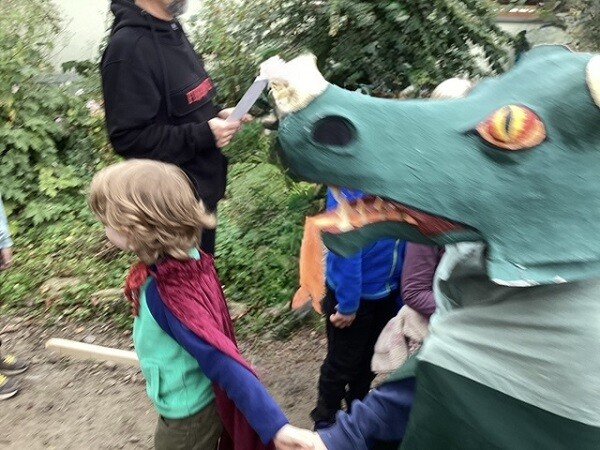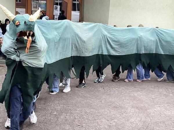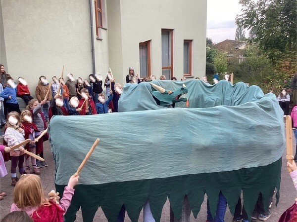 Nach dem gemeinsamen Michaelilied versammelten sich alle zum traditionellen Drachenkampf, bei dem die Kinder der 1. und 6. Klasse mitwirkten.